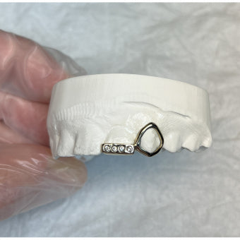 Choose any tooth on your top (upper) or bottom (lower) and is available in yellow or white (silver) dental gold and 10k, 14k or 18k yellow, rose or white gold (not plated). The type of alloy can be choosen after item is added to the cart. Our alloys do not tarnish or change colour. Every piece of grillz made from precious gold comes with a gold certificate that serves to verify the authenticity.